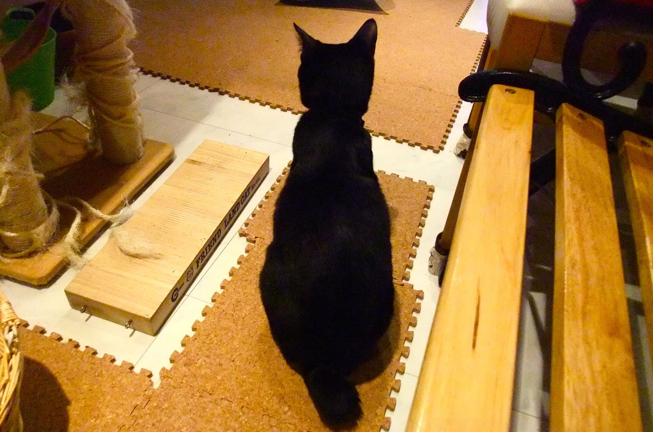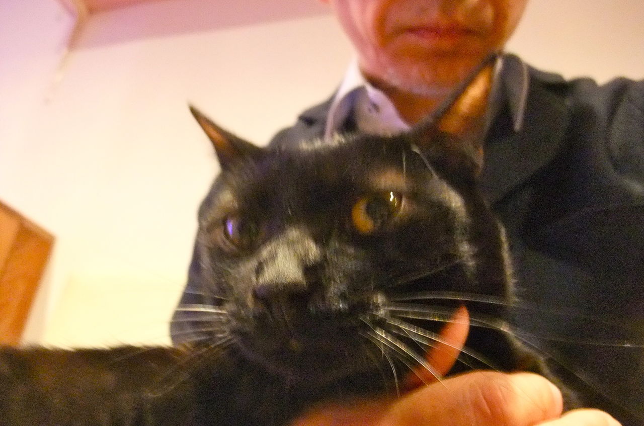 抜け目のない黒い猫がちゃっかりすり寄ってきたので、