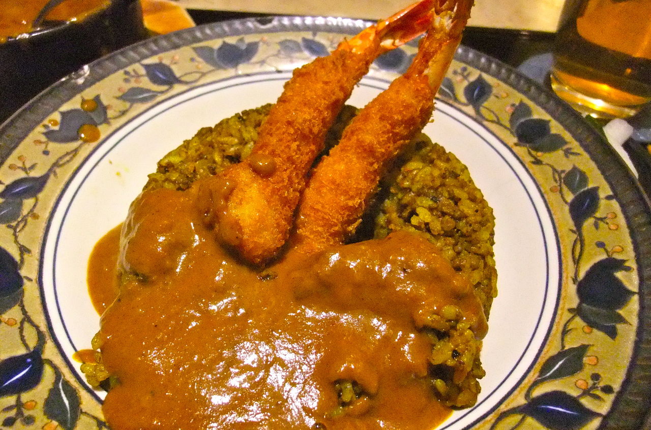 見た目のインパクトは抜群!! ドライカレーに海老フライが、実は、閉館間際なので、ドミグラスソースの仕込みはすでに終了しており、